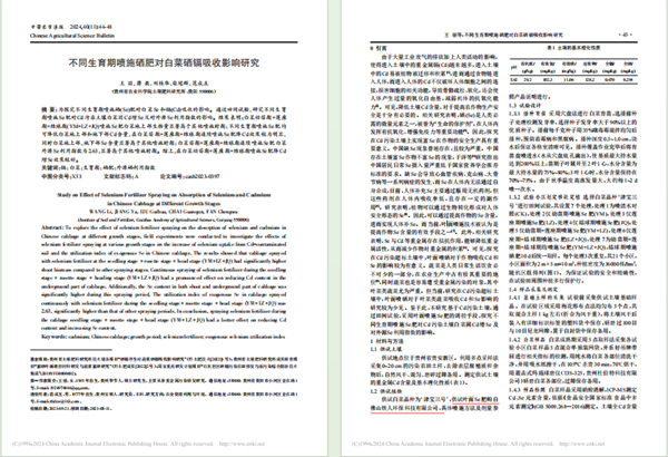 近日,貴州省農業科學院土壤肥料研究所在由中國農學會主辦的綜合性農業學術期刊《中國農學通報》發表了研究文章《不同生育期噴施硒肥對白菜硒鎘吸收影響研究》。貴州省農業科學院土壤肥料研究所研究團隊采用葉面噴施硒肥的調控手段,開展田間試驗,研究不同生育期噴施硒肥對鎘污染土壤白菜固鎘增硒及對外源硒利用指數的影響。本次研究所選用的供試葉面硒肥是佛山市鐵人環保科技有限公司生產的含硅水溶肥料“噴噴富”。研究結果表明,參照《富硒食品硒含量分類標準》(DB 124.01-2010),在白菜不同生育時期噴施“噴噴富”,白菜均達到富硒水平,在白菜幼苗期+蓮座期+結球期噴施“降鎘增硒”效果更佳。